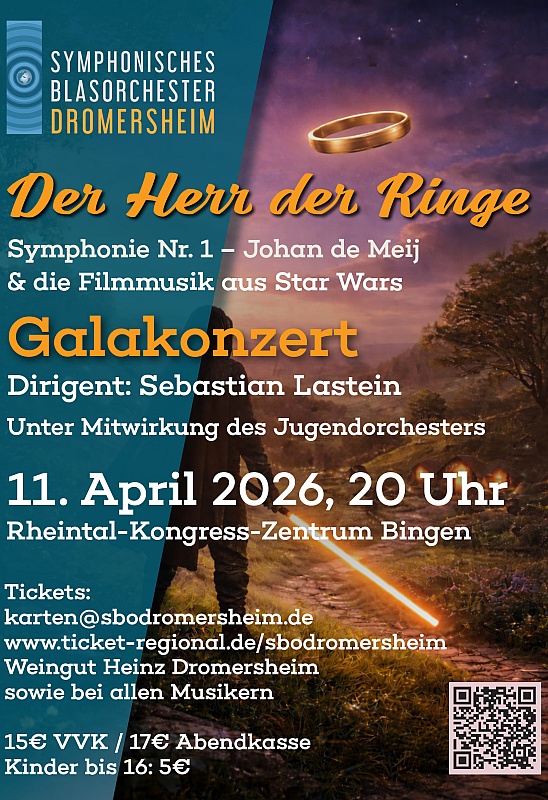 Erleben Sie die Musik von zwei der bekanntesten Geschichten unserer Zeit – live mit dem Symphonischen Blasorchester Dromersheim. Eine Reise von Mittelerde zu einer weit entfernten Galaxis: episch, emotional und mitreißend.